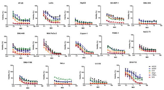 Oncolytic activity of various recombinant vaccinia viruses against different cancer cell lines. Graphs show the viability (%) of two different colon cancer cell lines (HT-29, LoVo), four different hepatocellular carcinoma cell lines (HepG2, Sk-Hep-1, SNU352, SNU449), three different pancreatic cancer cell lines (MIA-PaCa2, CAPAN1, PANC1), two different cholangiocarcinoma cell lines (HuCC-T1, SNU-1196), a cervical cancer cell line (HeLa), an osteosarcoma cell line (U-2 OS), and a murine melanoma cell line (B16-F10) when infected with each virus at different concentrations for 72 h.