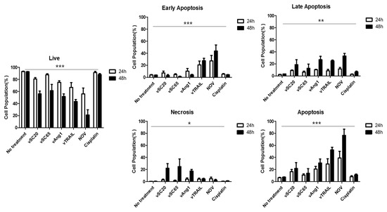 Cells seeded in 6-well plates were treated with PBS (control), each virus (vSC20, vSC65, vAng, vRAIL, NOV), or cisplatin, then incubated in a CO2 incubator. After 24 h and 48 h, cells were harvested by trypsinization, washed with PBS, and suspended in PBS containing 2% BSA. Cells were then suspended in 100 μL binding buffer and 4 μL FITC Annexin V (BD sciences, San Jose, CA, USA), and 4 μL propidium iodide was added to the cell suspension. The suspension was gently vortexed and incubated for 15 min at room temperature (25 °C) in the dark. Apoptosis and necrosis were analyzed by flow cytometry using the Navios flow cytometer (Beckman Coulter, Pasadena, CA, USA). The FACS data were analyzed using Kaluza Analysis Software 2.1 (Beckman Coulter).