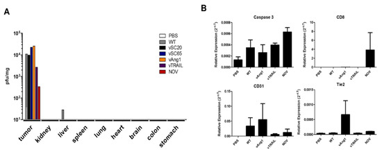 Two or three 5-week-old nude male mice per each group were given subcutaneous injections of 1 × 107 HT-29 human cancer cells in 100 µL PBS (n = 2 for PBS group, n = 3 for each virus group). At 7 d after injection of HT-29 or CT26 cells, the mice were given intraperitoneal injections of PBS or 1 × 107 pfu WT, vSC20, vSC65, vAng, vTRAIL, or NOV in 100 µL PBS. Then, 7 d post infection, mice were sacrificed and whole sections of the stomach, colon, brain, heart, lung, spleen, liver, kidney, and tumor were taken and homogenized in PBS. Viruses in these tissues were titrated using U2-OS cells, and viral yield was calculated per milligram of tissue (pfu/mg). BALB/c mice and CT26 cells were used to measure the mRNA expression of caspase 3, CD8, CD31, and Tie2 in the tumor tissue 7 d after intraperitoneal injection of each virus.