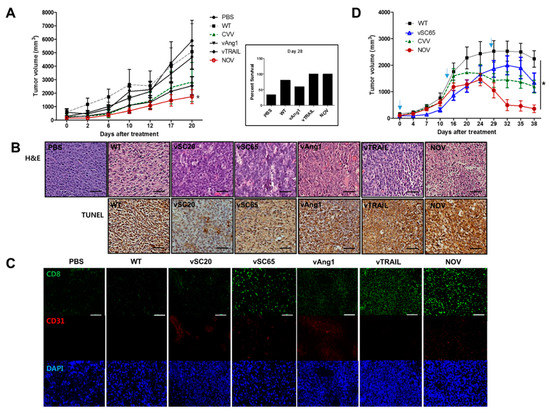Therapeutic efficacy of NOV in a colorectal cancer (CRC) syngeneic mouse model. (A) Tumor growth in a CT26-bearing mouse cancer model treated with PBS or viruses (left). Percent survival of mice in each treatment group (right). N = 5. * p < 0.5 (t-test, NOV vs. WT). (B) Hematoxylin and eosin (H&E) staining and transferase dUTP nick end labeling (TUNEL) results for tumor tissues of mice treated with PBS and viruses. Scale bar = 10 µm (C) Immunofluorescence staining of CD8+ cells (CD8), vascular cells (CD31) and nuclei (DAPI). Scale bar = 10 µm (D) Therapeutic efficacy of each virus in the CT26-induced tumor model. When the tumor reached 100 mm3, each virus treatment was started. The treatment schedules were noted with downwards arrows. N = 4. * p < 0.5, one-way ANOVA.