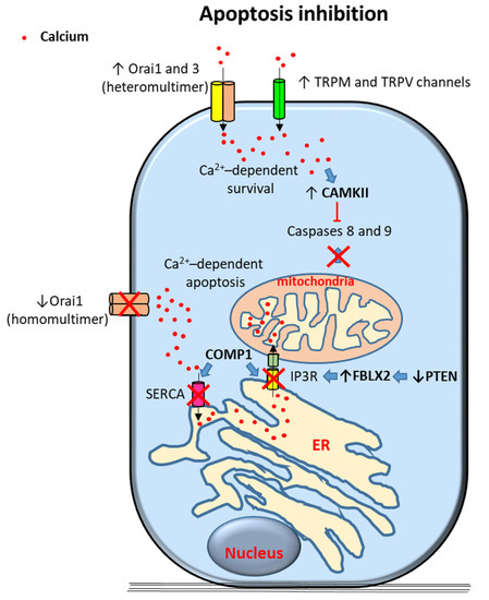 Proposed mechanisms of calcium-dependent apoptosis inhibition in prostate cancer (PCa) cells. Survival signals are induced by calcium entry through transient receptor potential (TRP) TRPM and TRPV channels and Orai 1 and 3 heteromultimers. Elevation of cytoplasmic calcium levels trigger different anti-apoptotic signals including caspase 8 and 9 inhibition by activation of Calcium/Calmodulin-Dependent Kinase II (CAMKII). Alternative mechanisms include inhibition of calcium-dependent mitochodrial apoptosis; excess of intracellular calcium is inhibited by downregulation of Orai homomultimers, of sarco/endoplasmic reticulum calcium ATPase (SERCA) (via cartilage oligomeric matrix protein (COMP) expression) and of IP3R (via COMP1 expression and PTEN (phosphatase and tensin homolog deleted on chromosome 10) channels in PCa cells. Arrows indicate upregulated expression or activity (↑) and downregulated expression or activity (↓). Crosses (X) and ˫ symbol indicate inhibition. Blue filled arrows indicate stimulation. ER: Endoplasmic reticulum. F-box protein XL2: FBXL2.