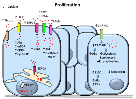 Proposed mechanisms of calcium-dependent proliferation in prostate cancer (PCa) cells. Upregulation of T-Type Calcium Channels (TTCC) increases the proliferative signals Akt kinase, mammalian target of rapamycin (mTOR), cyclin-dependent kinase 4 (CDK4) and cyclin D1. Transient receptor potential (TRP)V6 (TRPV6) increase proliferation via calcium-dependent activation of Nuclear factor of activated T-cells (NFAT). TRPM4 induces proliferation through activation of calcium-dependent Akt and catenin/Tcf/Lef signaling. Piezo1, TRPC6 and TRPM7 contribute to increased calcium cytosolic levels. Nuclear localization of TRPM2 as well as sarco/endoplasmic reticulum calcium ATPase (SERCA) also promote PCa cell proliferation. Upregulation of muscarinic acetylcholine receptor M3 (CHRM3) induces Akt, glycolysis, lipogenesis, and androgen receptor (AR) re-activation via activation of Calcium/Calmodulin-Dependent Kinase Kinase (CAMKK) causing cell proliferation. Proliferation is also triggered by overactivation of Akt and Extracellular-regulated (ERK) kinases by S100 proteins and by downregulation of regucalcin. Arrows indicate upregulated expression or activity (↑) and downregulated expression or activity (↓). Blue filled arrows indicate stimulation. ER: Endoplasmic reticulum.