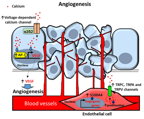 Proposed mechanisms of calcium-dependent angiogenesis in prostate cancer (PCa) and endothelial (EC) cells. PCa cells secrete the angiogenic factor VEGF (vascular endotelial growth factor) by increasing intracellular calcium [Ca2+]i via voltage-dependent calcium channel α2δ2 auxiliary subunit overexpression. [Ca2+]i upregulates VEGF through activation of transcription factor Activator protein 1 (AP-1). ECs in the primary prostate tumor induce angiogenic genes by overexpression of S100 proteins. [Ca2+]i upregulation by Transient receptor potential (TRP) TRPC, TRPA and TRPV channels induces proliferation of ECs in prostate primary tumors. Arrows indicate upregulated expression or activity (↑). Blue filled arrows indicate stimulation.
