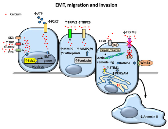 Proposed mechanisms of calcium-dependent Epithelial to Mesenchymal Transition (EMT), migration and invasion in prostate cancer (PCa) cells. Upregulation of intracellular calcium levels dependent on K+ channel (small conductance calcium-activated potassium channel 3) SK3, Transient receptor potential (TRP) and Orai channels overactivate transcription factor Zinc finger E-box-binding homeobox 1 (Zeb1) triggering the expression of EMT genes. EMT genes are also activated by ATP-stimulated P2X7 channel. Invasion of PCa cells is mediated by upregulation of metalloproteases (MMPs) and cathepsin B via TRPV2 and TRPC6-dependent increase of cytosolic calcium levels by a constitutive mechanism. MMPs are also increased by psoriasin. Prostate cell migration is promoted by actin remodeling via calcium receptor (CasR)/calpain/filamin and Wnt5a/Calcium/Calmodulin-Dependent Kinase (CAMK)II pathways. Decreased annexin II and increased Stromal-interacting molecule 1 (STIM1)/Akt kinase activation lead to enhanced cell migration as well. Decreased TRPM8 expression decrease in late stages of androgen-insensitive PCA and is associated with increased cell migration. Arrows indicate upregulated expression or activity (↑) and downregulated expression or activity (↓). Crosses (X) indicate inhibition. Blue filled arrows indicate stimulation. ER: Endoplasmic reticulum.