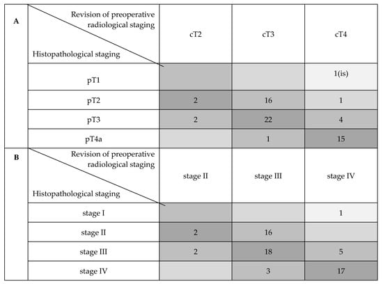 Compared distribution of cT with pT and cTNM with pTNM stages (AJCC 2017). (A) Comparison of cT and pT distribution. (B) Comparison of cTNM and pTNM stage distribution.
