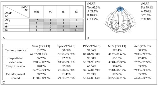 Accuracy in the radiological assessment of anterior commissure (AC) involvement. (A) Graphical representation of concordance between CT and histopathology in anterior commissure assessment. (B) Percentage of cancer involvement of anterior commissure in rMAP and pMAP. (C) Sensitivity (Sens), specificity (Spec), positive predictive value (PPV), negative predictive value (NPV) and accuracy (Acc) of CT in anterior commissure. CI: confidence interval, rMAP: radiological glottic map and pMAP: histopathological glottic map.