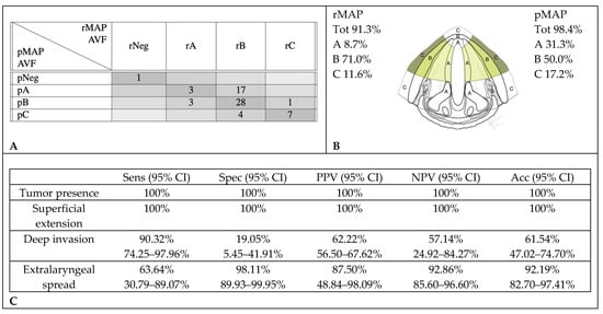 Accuracy in radiological assessment of anterior vocal fold (AVF) involvement. (A) Graphical representation of concordance between CT and histopathology in anterior vocal fold assessment. (B) Percentage of cancer involvement of anterior vocal fold in rMAP and pMAP. (C) Sensitivity (Sens), specificity (Spec), positive predictive value (PPV), negative predictive value (NPV) and accuracy (Acc) of CT in anterior vocal fold. CI: confidence interval, rMAP: radiological glottic map and pMAP: histopathological glottic map.