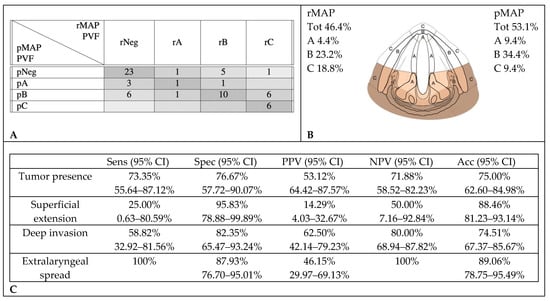 Accuracy in radiological assessment of posterior vocal fold (PVF) involvement. (A) Graphical representation of concordance between CT and histopathology in posterior vocal fold assessment. (B) Percentage of cancer involvement of posterior vocal fold in rMAP and pMAP. (C) Sensitivity (Sens), specificity (Spec), positive predictive value (PPV), negative predictive value (NPV) and accuracy (Acc) of CT in posterior vocal fold. CI: confidence interval, rMAP: radiological glottic map and pMAP: histopathological glottic map.