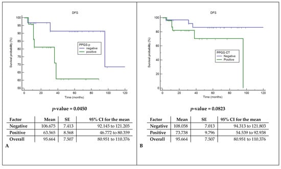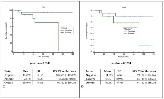 Cox regression models showed a significant correlation between the presence of pathologically documented tumor extensions in the pPGS and shorter DFS and DSS (p: 0.045 and 0.015), while CT invasions did not correlate with prognosis (Figure 5).