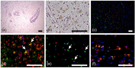 To prepare tissue sections, we cut 3 µm thick slices from formalin-fixed, paraffin-embedded tissue blocks, dewaxed twice with xylene and then rehydrated them in a graded series of ethanol (100%, 96%, 70%; diluted in distilled water), as well as in distilled water. Samples were then processed either by hematoxylin-eosin staining (H&E), 3,3-diaminobenzidine (DAB) IHC, or double-fluorescence staining. All staining procedures and evaluations were supervised by an experienced neuropathologist. Normal cerebellar tissue with specific staining of Purkinje cells as described by Fernandez-Pol [27] served as positive controls. Stains under omission of primary antibody and RPS27-negative cells in the cerebellar tissue (e.g., granule cells) were used as internal negative controls.