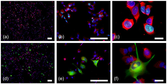 RPS27 staining in conjunction with Ki67 and GFAP positivity in GBM stem-like cells. (a–c) Immunofluorescence double staining for RPS27 (red) and Ki67 (green). (d–f) Immunofluorescence double staining for RPS27 (red) and GFAP (green). DAPI = blue, scale bars in (c) and (f) = 20 µm, otherwise scale bars = 100 µm. For the single color channels see Figure S2.