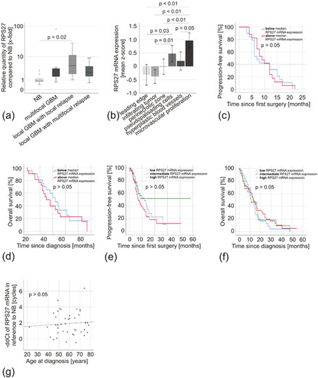 Looking at GBM, very similar results could be obtained. Independent of their growth pattern (primary multifocal tumors, mean expression 12.7-fold due to a high outliner, median expression 3.3-fold; primary local tumors with local relapse, mean expression 5.6-fold; and primary local tumors with multifocal relapse, mean expression 2.3-fold) there was no difference in RPS27 mRNA expression (p > 0.05) (Figure 7a). We detected no significant difference between primary tumors and their respective relapses (p > 0.05; primary local GBM with local relapse, mean expression 5.6-fold vs. their local relapse, mean expression 4.7-fold; primary local GBM with multifocal relapse, mean expression 2.3-fold vs. their multifocal relapse, mean expression 14.3-fold). The IVY Glioblastoma Atlas Project (IVY-GAP) database allows examining regional differences in mRNA expression within the tumor [32]. It revealed enhanced RPS27 expression in microvascular proliferation and pseudopalisading cells around necrosis, but not at the leading edge and by infiltrating tumor cells (Figure 7b). We did not see any difference in the progression-free survival (PFS) or the OS of patients with RPS27 mRNA expression above or below the median 2.7-fold expression (p > 0.05) (Figure 7c,d), which was confirmed by analyzing TCGA data with the CBioportal analysis tool (Figure 7e,f) [33]. In addition, there was no correlation with other clinical characteristics including the patients’ age (Figure 7g), except for a weak correlation with Ki67 staining (r = 0.33, p = 0.04, Table 4).