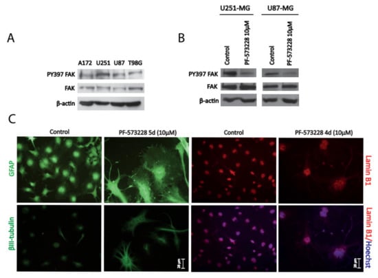 Inhibition of focal adhesion kinase (FAK) reshapes glioblastoma (GBM) cell morphology and increases cell size. (A) Cell lysates from different GBM cell lines (A172, U251-MG, U87-MG, and T98G) were analyzed for PY397 FAK and total FAK. β-actin was used as a loading control. GBM cell lines display active PY397 FAK, with U251-MG and U87-MG showing the highest levels. (B) U251-MG and U87-MG cell lysates (control or treated with PF-573228 10 µM) were analyzed for active and total FAK. β-actin was used as a loading control. FAK inhibitor effectively reduced PY397 FAK levels. (C) Glial Fibrillary Acidic Protein (GFAP), βIII-tubulin, and Lamin B1 immunostainings performed in U251-MG cells (after 4–5 days of treatment with PF-573228 10 µM). Cytoskeleton remodeling accompanied by cell body enlargement and lobulated/enlarged nuclei is revealed by Lamin B1 immunostaining. Bars = 28 µm.