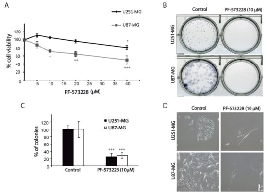 Next, we studied whether FAK inhibition affected GBM cell proliferation. We firstly performed WST-1 viability assays in GBM cells treated with different concentrations of PF-573228 (from 5 to 40 µM) for 24 hours. The results showed a significant decrease in cell viability from 10 µM in U87-MG cells and at 40 µM in U251-MG (Figure 2A).