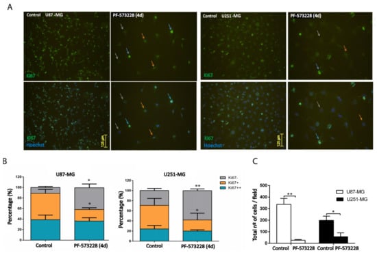 To specifically address the question of FAK inhibition affecting cell proliferation, we performed immunostaining against Ki67, a marker expressed by proliferative cells. Ki67 protein levels vary along the cell cycle, being higher in the G2/M phase and lower in the G0/G1 phase [14]. We counted the number of cells showing high (Ki67++), medium (Ki67+), or low (Ki67−) immunoreactivity for Ki67 after four days of treatment with PF-573228. We found a decrease of ~25% in the number of Ki67+ cells and an increase of ~30% of Ki67− cells in both U87-MG and U251-MG cell lines (Figure 3A,B). At the same time, we observed a dramatic decrease in the mean number of cells/field after the four days of treatment (92% and 72% decrease compared with the control in U87-MG and U251-MG cell lines, respectively; Figure 3C).