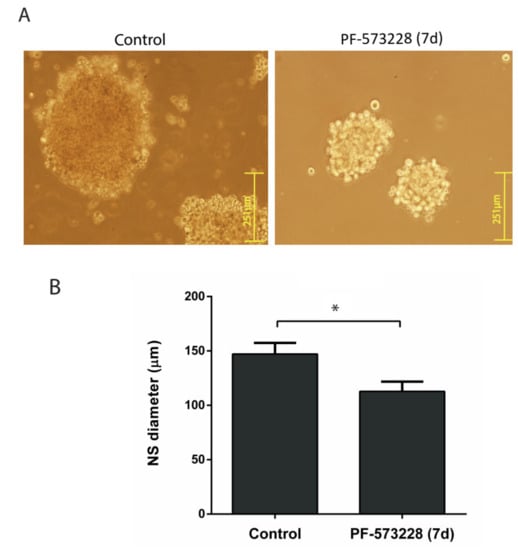 PF-573228 reduces neurosphere (NS) growth. (A) Representative images of U87-MG NSs grown for seven days in the presence or absence of PF-573228 (10 µM). (B) NSs grown in the presence of PF-573228 were smaller, with a reduction of 23% in their diameter (* p < 0.05; n = 4). Bars = 251 µm.