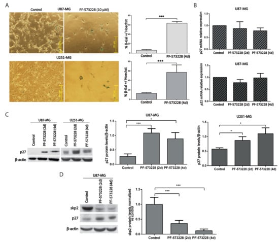 Analysis of Cdk inhibitors helps to identify senescent cells [16,17]. We, therefore, measured the mRNA levels of p21/CDKN1A/CIP1 and p27/CDKN1B/KIP1 in GBM cells after two or four days of treatment with PF-573228. The results showed no significant differences between control and treated cells (Figure 5B). However, p27 protein levels increased following treatment with PF-573228 in U87-MG and U251-MG cells (Figure 5C). These results suggest that PF-573228 stops GBM cell proliferation by stabilizing p27 protein.