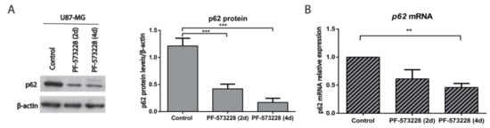 p62 is repressed upon FAK inhibition. (A) p62 was analyzed by Western blot in control cells or cells treated with FAK inhibitors and β-actin was used as a loading control. Plot shows p62 protein levels normalized to β-actin and indicates that p62 significantly decreases after treatment with PF-573228 (10 µM, two and four days; n = 10) compared with untreated cells. (B) p62 mRNA relative expression in control U87-MG cells and cells treated with PF-573228 (10 µM, two or four days). p62 mRNA levels decrease after FAK inhibition (** p < 0.01; *** p < 0.001; n = 4).