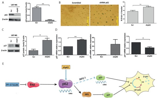 We investigated the effects of FAK inhibition in GBM cell proliferation. Our results in cell viability, clonogenic, and Ki67 immunostaining experiments indicate that the cell cycle is arrested upon treatment with PF-573228. The proliferative arrest occurs through increased p27 protein levels (p27 or p21 mRNA levels remain unaltered) and phenotypically correlates with a flattened cell body and SA-β-gal positivity, suggesting senescence entry. Interestingly, p62 is repressed by FAK inhibitors, PF-573228 and Defactinib. This finding prompted us to analyze p62-depleted cells, which transcriptionally upregulate p27 and increase SA-β-gal activity. Our results, therefore, indicate that p62 downregulation is associated with senescent phenotypes. In fact, p62 has recently been associated with longevity and its absence to aging in C. elegans [25]. We propose that FAK inhibition may be a valid strategy to counteract GBM progression through senescence deregulation.