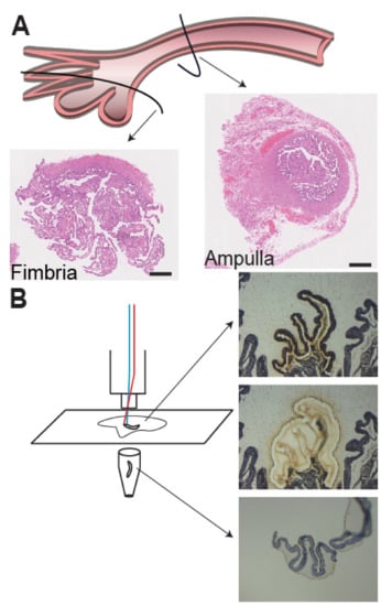 - Paik, D.Y.; Janzen, D.M.; Schafenacker, A.M.; Velasco, V.S.; Shung, M.S.; Cheng, D.; Huang, J.; Witte, O.N.; Memarzadeh, S. Stem-like epithelial cells are concentrated in the distal end of the fallopian tube: A site for injury and serous cancer initiation. Stem Cells 2012, 30, 2487–2497. [Google Scholar] [CrossRef] [PubMed]