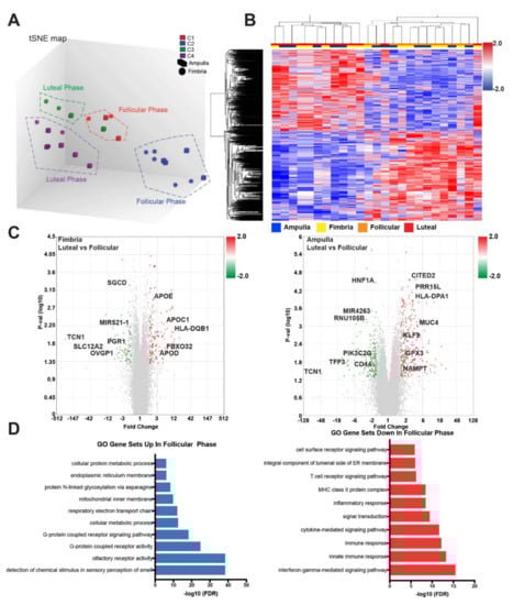 Transcriptional analysis shows distinct differences between the luteal and follicular phase with cases self-clustering according to ovulatory cycle. (A) tSNE plot of cases, generated using Ingenuity Pathway Analysis software, showed self-clustering groups according to ovarian cycle phase. C1, C2, C3 and C4 represent clusters of cases that group together according to similarity of gene effects across the ovarian cycle phases (luteal vs. follicular). (B) Heat map of the gene-level expression differences between the follicular and luteal phases (p = 0.01). (C) Volcano plot of the luteal versus follicular comparison in fimbria and ampulla (p < 0.05). (D) Gene Ontology (GO) gene set analysis shows top processes upregulated and downregulated in the follicular phase compared to the luteal phase of the ovarian cycle.