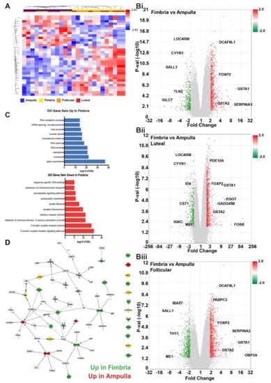 Gene expression analysis identifying differences in gene ontology pathway representation and gene upregulation and downregulation between fimbria and ampulla. (A) Heat map of supervised hierarchical clustering revealed significant differences (2-fold change, p < 0.05) in gene expression between ampulla and fimbria. As seen previously, some follicular and luteal phase genes segregate by fimbria and ampulla of the normal FTE expression pattern. (B) Volcano plots showing a comparison of i: fimbria compared to ampulla, independent of ovulatory phase, ii: fimbria compared to ampulla in the luteal phase, iii: fimbria compared to ampulla in the follicular phase. (C) Top gene processes upregulated and downregulated in the fimbria compared to the ampulla as determined by gene ontology. (D) Gene network of top differentially expressed genes by anatomy in the fallopian tube show genes up in the fimbria (green) and ampulla (red). Image was generated using Ingenuity Pathway Analysis software.