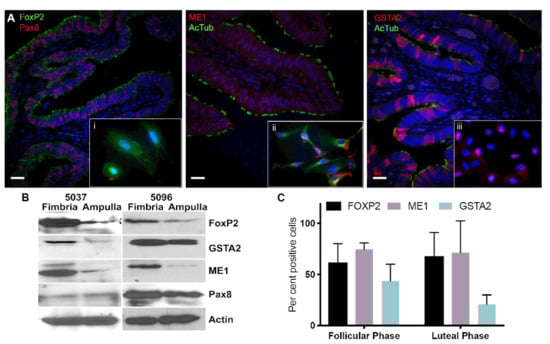 GSTA2, ME1 and FOXP2 show higher expression levels in the fimbria compared to the ampulla. (A) Immunofluorescence (IF) of the fimbria. The top panel shows a view of fimbria tissue at 10× magnification stained for GSTA2, ME1, FOXP2, PAX8 and ac-TUBULIN. In each panel an inset shows cells derived from fresh fimbria tissue, which were cultured on chamber slides, stained with the above markers and visualized at 63× magnification. Pax8 was used to identify secretory cells and acetylated-tubulin was used to show ciliated cells. Insets, i: FoxP2 and Pax8 localization in an FTE cell, ii: ME1 and acetylated-tubulin are found in the cytoplasm of cells and iii: GSTA2 and acetylated-tubulin expression in cells from normal FTE. GSTA2 is localized to the nucleus of FTE cells. (B) Immunoblot of two independent fresh fimbria and ampulla tissues from normal cases shows that GSTA2, FoxP2 and ME1 are highly expressed in fimbria compared to the ampulla. (C) IF was used to quantify the number of cells expressing GSTA2, FoxP2 and ME1 in the follicular and luteal phases. Scale bar: 100 µm. The uncropped blots and molecular weight markers of Figure 4B are shown in Figure S3.