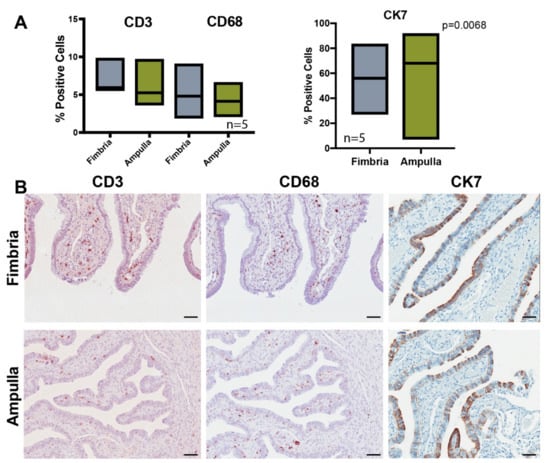 Immune cell profiling of the fimbria and ampulla show differences in immune cells between fimbria and ampulla. (A) Immunohistochemistry of CD3, CD68 and CK7 markers was performed on five cases to show the percentage of cells positive for each marker across fimbria and ampulla. Only CK7 showed significant differences in expression between the fimbria and ampulla. Statistical tests using an unpaired t-test were used in all comparisons (p < 0.05). (B) Bright field microscopic images of fimbria and ampulla tissue sections show differences in protein expression of CD3, CD68 and CK7 between the two tissues. Scale bar: 200 µm.
