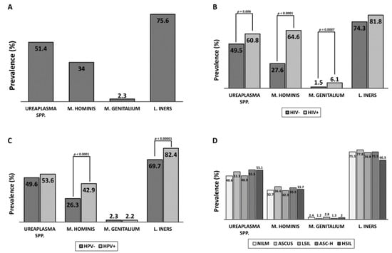 Relationship between Mycoplasmataceae abundance and cervical cancer risk factors. (A) Overall prevalence of the screened Mycoplasmataceae and Lactobacillus species in the cohort; (B) Comparison of prevalence between HIV+ and HIV− women; (C) Comparison of prevalence between HPV+ and HPV− women; (D) Comparison of prevalence between women based on cervical cytology.
