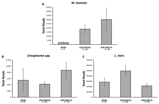 Relative abundance of Mycoplasma based on cervical cytology. Abundance among infected is the mean of positive 16s samples (n) adjusted by prevalence determined by PCR screen. Error bars represent standard error of the mean. (A) Expected number of M. hominis 16s DNA reads for 100 Tanzanian women of varying cervical cytology; (B) Expected number of Ureaplasma spp. 16s DNA reads for 100 Tanzanian women of varying cervical cytology; (C) Expected number of L. iners 16s DNA reads for 100 Tanzanian women of varying cervical cytology.