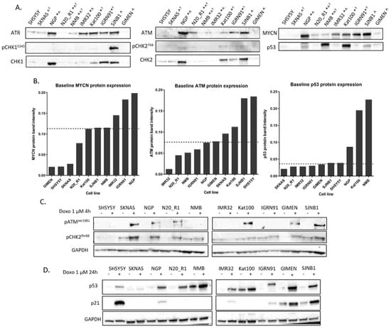 We analysed endogenous expression of key DDR proteins (ATM, ATR, CHK1, CHK2, MYCN and p53) in these cell lines as well as baseline activity of ATR, ATM (phospho-CHK1S345 and phospho-CHK2T68 and expression, respectively) by Western blot (Figure 1A). Mean protein band intensities of MYCN, ATM and p53 from two independent experiments are shown in Figure 1B. ATM and p53 function after activation with doxorubicin was also examined (Figure 1C,D, respectively).