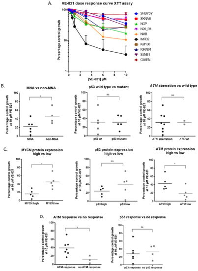 Determinants of ATR inhibitor sensitivity. (A) VE-821 (ATR inhibitor) dose response curves for NB cell lines, data are mean + SEM from 3 independent experiments. Cell lines were split into 2 groups based on (B) molecular features: MYCN amplification (MNA), p53 mutation status and ATM aberration (11q deleted or ATM mutated), (C) protein expression above (high) or below (low) median expression (Figure 1B) and (D) ATM and p53 responses after treatment with doxorubicin (1 µM). ATM and p53 response was determined by expression of pATMser1981 and p21, respectively (Figure 1C,D). Average percentage control growth at 10 µM VE-821 was plotted for cell lines belonging to each group (n = 3). * p < 0.05 Mann Whitney U test, ns: not significant, wt: wildtype).