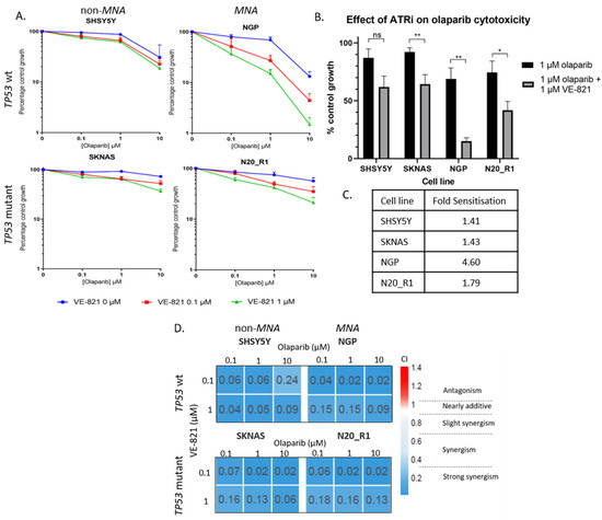 To test if growth inhibition by olaparib and VE-821 is synergistic, an XTT cell proliferation assay was carried out testing the response of four NB cell lines to increasing concentrations of olaparib with the addition of fixed concentrations of VE-821. SHSY5Y (non-MNA, p53 wt), SKNAS (non-MNA, p53 mutant), NGP (MNA, p53 wt) and N20_R1 (MNA, p53 mut) cells were treated with 0, 0.1, 1, and 10 µM olaparib with the addition of either 0, 0.1 or 1 μM VE-821 (Figure 3A). VE-821 significantly sensitized the SKNAS, NGP and N20_R1 cell lines to olaparib, fold sensitisation 1.43-4.60 (Figure 3B,C). Although not statistically significant, the cytotoxicity of olaparib was increased by VE-821 in the SHSY5Y (non-MNA, TP53 wt) cell line, fold sensitisation 1.41. Synergism between VE-821 and olaparib was determined by combination index analysis (calcusyn) where combination index (CI) <1 indicates synergy. PARP inhibition was synergistic with ATR inhibition in all cell lines, irrespective of MYCN or TP53 status (Figure 3D). This was also confirmed by clonogenic survival assay (Figure S7).