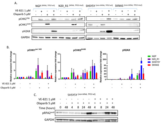 Effect of VE-821 and olaparib combination on replication stress. (A) pCHK1S345, pCHK2T68, γH2AX protein expression of NGP, N20_R1, SHSY5Y and SKNAS cells after incubation with 5 μM olaparib and/or 1 µM VE-821 for 24 h. (B) pCHK1S345, pCHK2T68, γH2AX mean fold change in protein band intensity measured by densitometry (ImageJ) and normalised to glyceraldehyde 3-phosphate dehydrogenase (GAPDH) loading control, data are mean + SEM from 3 independent experiments. (C) pRPA2S8 expression in SHSY5Y cell line in response to 5 μM olaparib with or without 1 µM VE-821 over 48 h. Images of the uncropped Western blots can be found in Figure S8.