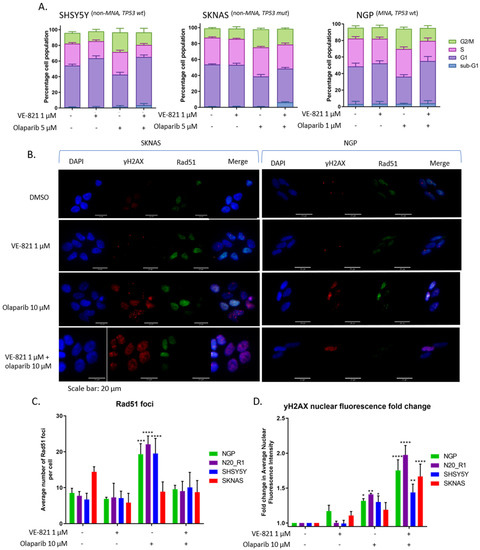 Effect of VE-821 and olaparib combination on cell cycle and homologous recombination repair (HRR). (A) Cell cycle analysis of SHSY5Y, SKNAS and NGP cell lines treated with 5 µM (SHSY5Y and SKNAS) or 1 µM (NGP) olaparib in combination with 1 μM VE-821 for 24 h. Data are mean + SEM from 3 independent experiments. (B) Representative γH2AX and Rad51 foci images from SKNAS and NGP cell lines treated with 1 µM VE-821, 10 µM olaparib or both for 24 h. (C) Average number of Rad51 foci per cell for NGP, N20_R1, SHSY5Y and SKNAS cell lines treated with 1 µM VE-821, 10 µM olaparib or both, n = 4 + sd. (D) Average γH2AX nuclear fluorescence intensity for NGP, N20_R1, SHSY5Y and SKNAS cell lines treated with 1 µM VE-821, 10 µM olaparib or both, fold change from control (DMSO), data are mean + SEM from 4 independent experiments. * p ≤ 0.05, ** p ≤ 0.01, *** p ≤ 0.001, **** p ≤ 0.0001, 2-way ANOVA difference from control (DMSO).