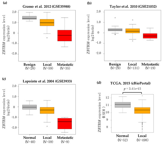 In the present study, we exploited 10 publicly available and well-annotated datasets (including gene expression, genomic information and clinico-pathological data) to unravel a function of ZBTB38 in prostate cancer. We observed that ZBTB38 is rarely mutated or rearranged in localised and metastatic prostate cancer. However, we observed that ZBTB38 has significantly lower level of expression in localised prostate cancer compare to benign tissues and the difference is extended in metastatic prostate cancer, whether ZBTB38 expression was monitored by micro-array or RNA-sequencing technology.
