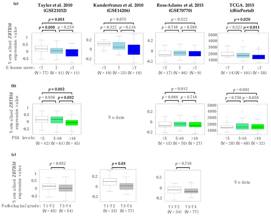 Low expression of ZBTB38 mRNA is correlated with advanced stage prostate cancer. Correlation between ZBTB38 mRNA expression and Gleason score (a), PSA levels at diagnosis (b) and pathological grade (c) in prostate cancer. N: number of patients per class. Significant p-value (p < 0.05) are highlighted in bold.