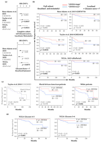 Prognostic significance of ZBTB38 expression in patients with prostate cancer. (a) Association between low levels of ZBTB38 expression and the relapse. Top panel: study including all patients. Bottom panel: study including patients with intermediate risk cancer (i.e., Gleason score = 7). (b) Association between ZBTB38 expression and disease-free survival in three independent cohorts of patients. Left panel: disease-free survival of all patients according to ZBTB38 expression levels. Right panel: disease-free survival of intermediate risk (Gleason score = 7) patients according to ZBTB38 expression levels. (c) Association between ZBTB38 expression and disease-free survival in white and black/African American patients from the Taylor’s cohort. Left panel: disease-free survival of white and black/African American patients. Centre panel: disease-free survival of black/African American patients according to ZBTB38 expression levels. Right panel: disease-free survival of white patients according to ZBTB38 expression levels. (d) Association between ZBTB38 expression and disease-free survival of patients with Gleason score 3 + 4 and 4 + 3 from the TCGA cohort. N: number of patients per class. Significant p-value (p < 0.05) are highlighted in bold.