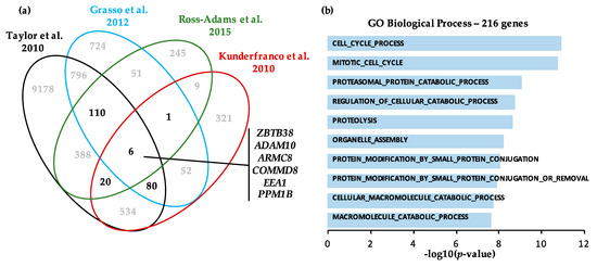 Gene expression datasets were filtered to compare localised tumours with highest expression levels of ZBTB38 (4th quartile) and tumours with lowest expression levels of ZBTB38 (1st quartile). GEO2R was used to identify differentially expressed genes in the different cohorts, using p < 0.001 as cut-off. Five studies report gene expression by array for >50 patients with localised tumours (see Figure 1a). We excluded the Lapointe et al. dataset (GSE3933) because of the poor relationship between probe and gene identifiers. We eventually considered Taylor et al. (GSE21032), Grasso et al. (GSE35988), Kunderfranco et al. (GSE14206) and Ross-Adams et al. (GSE70770). The web-based g-profiler portal (https://biit.cs.ut.ee/gprofiler/gost) was used to homogenise gene names and perform subsequent overlaps between the different lists of differentially expressed genes [69].