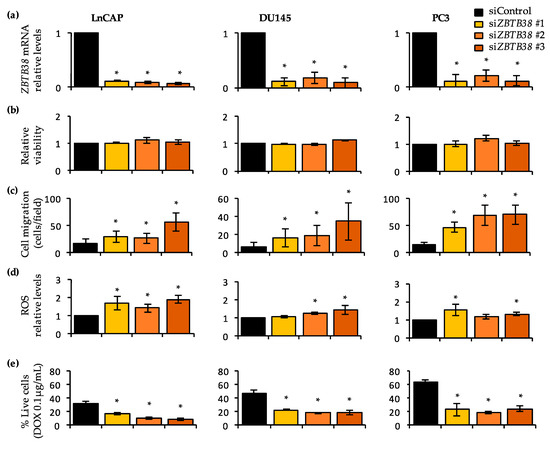 Knock-down of ZBTB38 promotes ROS accumulation, cell migration and doxorubicin sensitivity in prostate cancer cell lines. (a) RT-qPCR validation of ZBTB38 depletion 48 hours after transfection of control and ZBTB38 siRNAs in prostate cancer cell lines LnCAP, DU145 and PC3 (n = 3). (b) Consequence of ZBTB38 depletion on cell viability monitored by propidium iodide intake, 48 hours after transfection of control and ZBTB38 siRNAs (n = 3). (c) Consequence of ZBTB38 depletion on cell migration assessed by transwell assays, 48 hours after transfection of control and ZBTB38 siRNAs (n = 3). (d) Consequence of ZBTB38 depletion on ROS levels monitored by DCFDA intensity 48 hours after transfection of control and ZBTB38 siRNAs (n = 3). (e) Graph reporting the relative proportion of alive prostate cancer cells 48 hours after transfection of control and ZBTB38 siRNAs and further exposure to doxorubicin (n = 3). *, p < 0.05, t-test (vs. control).