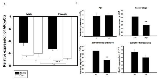Association of AR mRNA expression with clinical characteristics in 137 PTC samples. (A) The expression of AR mRNA is significantly decreased in PTC tumor specimens than its adjacent normal tissue in both male and female gender patients. (B) Association of AR with clinical features in 137 PTC patients stratified as follows: age; cancer risk, low risk (stage I + II) vs. High (stage III + IV); the presence of lymph node metastasis and extrathyroidal extension.* p < 0.05 ** p < 0.01 *** p < 0.01 n.s: non-significant.