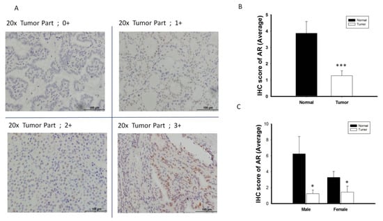 The analysis of androgen receptor (AR) protein expression level by immunohistochemistry (IHC) (n = 38). (A) Scoring classification of IHC; 0, negative (−); 1+, weakly positive; 2+, moderately positive (++); 3+, strongly positive (+++). (B) Normal thyroid tissue express high expression level of AR protein scoring than its paired cancerous specimen. (C) The expression of AR protein is significantly decreased in PTC tumor specimens than its adjacent normal tissue in both male and female gender patient. * p < 0.05 *** p < 0.001