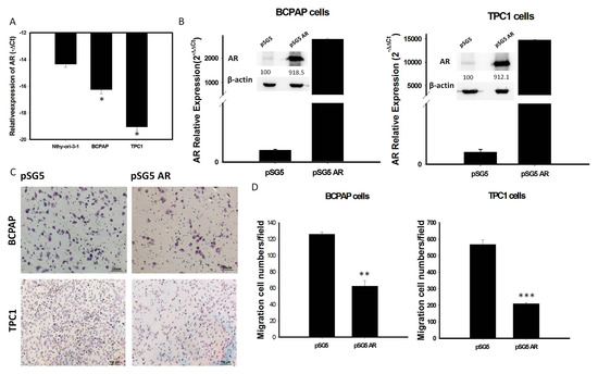 (A): The endogenous mRNA expression of AR in normal thyroid cell line (Nthy-ori-3-1) is higher than PTC-derived cancer cell lines (BCPAP and TPC1); (B) Quantification of mRNA and protein expression levels of AR after transfection with pSG5-AR and pSG5 in BCPAP cells and TPC-1 detected by qRT-PCR and Western blotting. The relative expression level of AR mRNA is presented as 2−ΔΔCt (AR-18S). (C) Reprensentative image of the cell migratory abilities of BCPAP cells and TPC-1 transfected with pSG5-AR and pSG5 in the Transwell (Corning) migration assay. (D) Quantitative analysis of the migratory abilities of BCPAP and TPC-1 cells transfected with pSG5-AR and pSG5. Data are presented as the means of three independent experiments, and bars represent the SDs. * p < 0.05, ** p < 0.01, *** p < 0.01