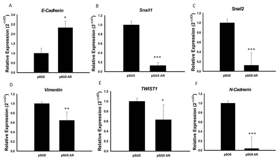 AR repressed EMT process by regulation of the expression of EMT marker genes. (A) E-cadherin, (B) Snail1, (C) Snail2, (D) Vimentin, (E) TWIST1, and (F) N-cadherin mRNA levels were analyzed by qRT-PCR, and 18S mRNA was used as a control to ensure equal loading. Three independent experiments for measuring were analyzed by Western blotting. * p < 0.05, ** p < 0.01 and *** p < 0.001 compared with the control group.