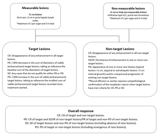 Radiologic response was evaluated every 4–6 weeks using dynamic CT or MRI, according to the modified Response Evaluation Criteria in Solid Tumors (mRECIST) guidelines [21,22]. Radiologic response was dichotomized as objective response, including complete response (CR) and partial response (PR), or non-regression, including stable disease (SD) and progressive disease (PD) (Figure 1). Radiologic response was evaluated by the consensus of two radiologists, who were blinded to patient demographic information and patient outcome. The best overall response during treatment was categorized as the final response [19].