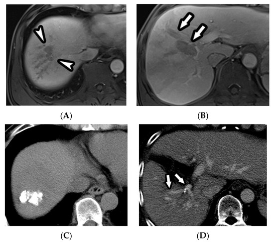(A) A 51-year-old male patient with HCC and lobar PVTT. (A,B) Contrast-enhanced axial MRI images in the venous phase show a small HCC (3.4 cm maximum diameter, arrowheads) with right lobar PVTT (arrows). (C,D) Six months after TACE plus RT and additional TACE, non-contrast enhanced (C) and contrast-enhanced axial CT (D, in the venous phase) images show a compact lipiodol uptake in the tumor (C) and disappearance of the right lobar PVTT (D, arrows), with a decrease in volume of the right hemiliver.