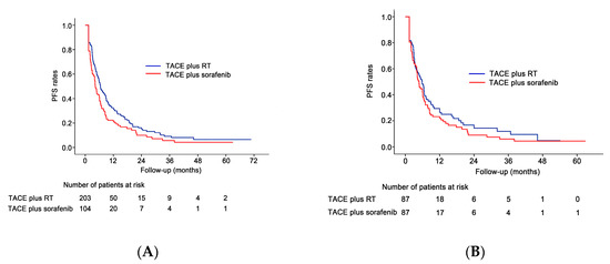 PFS outcomes before and after propensity score matching. (A) The PFS rate was significantly higher in the TACE plus RT group than in the TACE plus sorafenib group (p = 0.017) in the original study cohort. (B) The PFS rate did not differ significantly between the two groups (p = 0.258) in the propensity matched cohort.