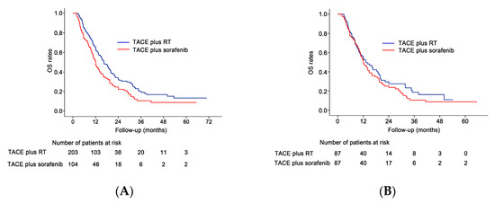 OS outcomes before and after propensity score matching. (A) The OS rate was significantly higher in the TACE plus RT group than in the TACE plus sorafenib group (p = 0.007) in the original study cohort. (B) The OS rate showed no statistically significant difference between the two groups (p = 0.299) in the propensity matched cohort.