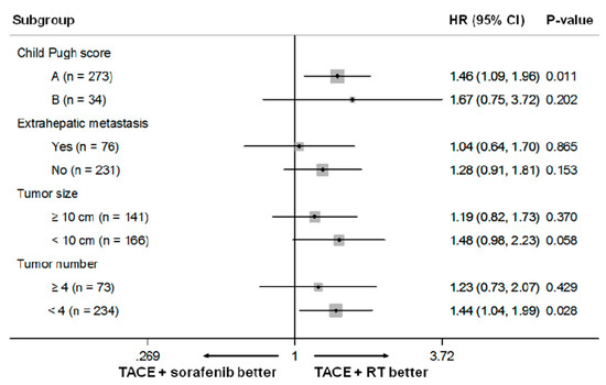 Stratified subgroup analyses were performed according to the significant predictors for OS identified in the multivariable analysis (Figure 5). TACE plus sorafenib treatment was associated with a significantly poorer OS than TACE plus RT treatment in the subgroup of patients with Child–Pugh class A (HR, 1.46; 95% CI, 1.08–1.95; p = 0.011) and tumor number < 4 (HR, 1.44; 95% CI, 1.04–1.99; p = 0.028). The TACE plus sorafenib treatment showed poorer OS than the TACE plus RT in the subgroup of patients with maximal tumor size < 10 cm, with borderline statistical difference (HR, 1.48; 95% CI, 0.98–2.23; p = 0.058).