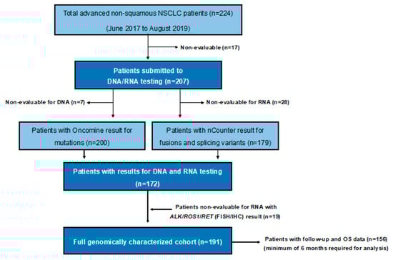 Between June 2017 and August 2019, a total of 224 advanced NSCLC patients were prospectively diagnosed at our institution. The last follow-up and update of the database was done in November 2019. Molecular DNA and/or RNA testing yielded an informative result in 207 patients (92%). Among them, 191 (85%) had both DNA and RNA informative results. All successfully genotyped patients had available clinical data and follow-up (Figure 1).
